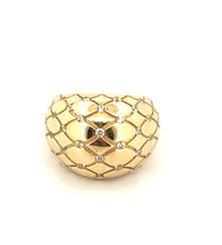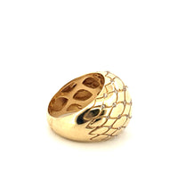 This sophisticated puff ring showcases refined craftsmanship in authentic 14k yellow gold, designed for those who appreciate quality and elegance. The dimensional puff silhouette is enhanced by an intricate grid pattern that creates visual depth and reflects light with exceptional brilliance. Set with lustrous cubic zirconia stones, this ring delivers the sparkle and prestige of fine jewelry while maintaining everyday wear ability. Perfectly proportioned at size 7 1/4" and weighing 11.1 grams, it provides substantial presence on the finger without compromising comfort. Whether worn as a standalone statement piece or layered with other rings, this versatile design transitions seamlessly from casual to formal settings. An investment in timeless style that combines luxury materials with enduring appeal.