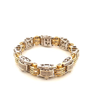 This exquisite two-tone bracelet combines the timeless elegance of 14k gold in both white and yellow finishes, creating a sophisticated contrast that enhances any jewelry collection. Set with sparkling diamonds throughout, this piece showcases expert craftsmanship and premium materials. The generous 8 1/2" length accommodates most wrist sizes comfortably, while the substantial 60.3-gram weight reflects the quality and density of the gold construction. The dual-tone design offers versatility, seamlessly complementing both warm and cool-toned metals in your existing jewelry wardrobe. Ideal for special occasions or as a refined everyday luxury piece, this bracelet delivers lasting brilliance and enduring value.